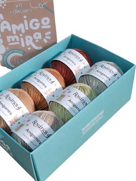 – 6 novelos x 20g de fio Amigomira (100% algodão) nas cores 14, 05, 06, 09, 106 e 26.