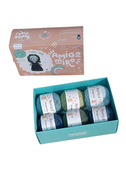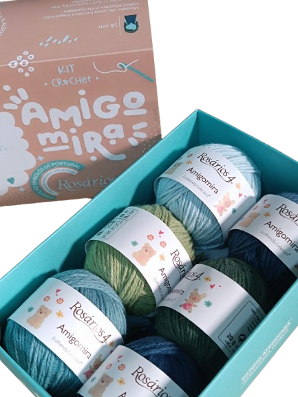 – 6 novelos x 20g de fio Amigomira (100% algodão) nas cores 84, 73, 111, 74, 99 e 103.