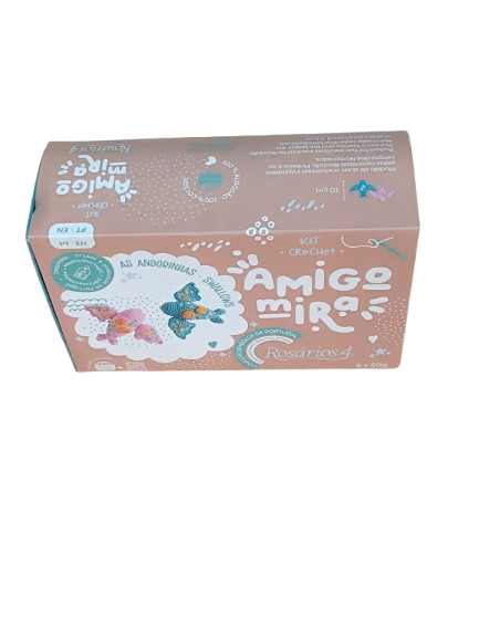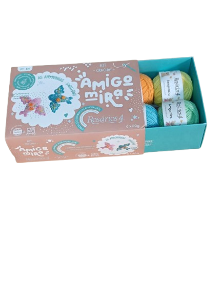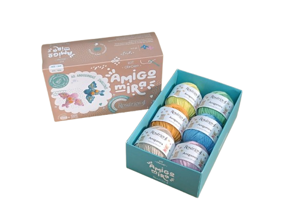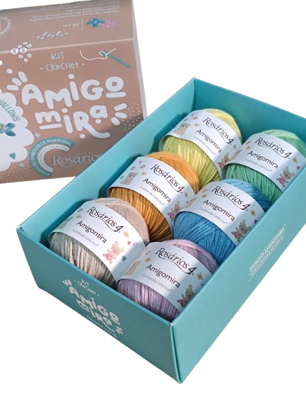 – 6 novelos x 20g de fio Amigomira (100% algodão) nas cores 14, 17, 54, 16, 30 e 105.