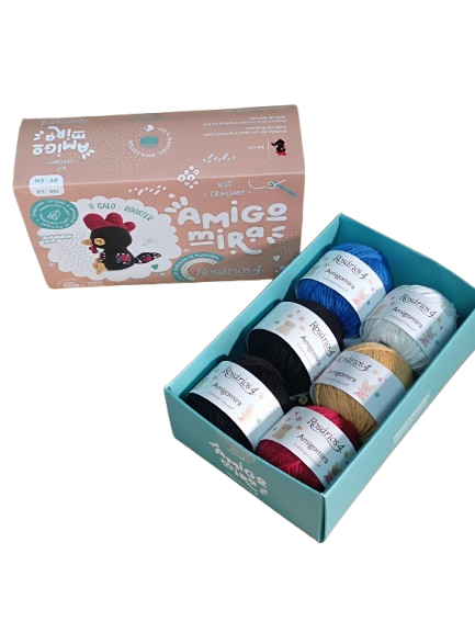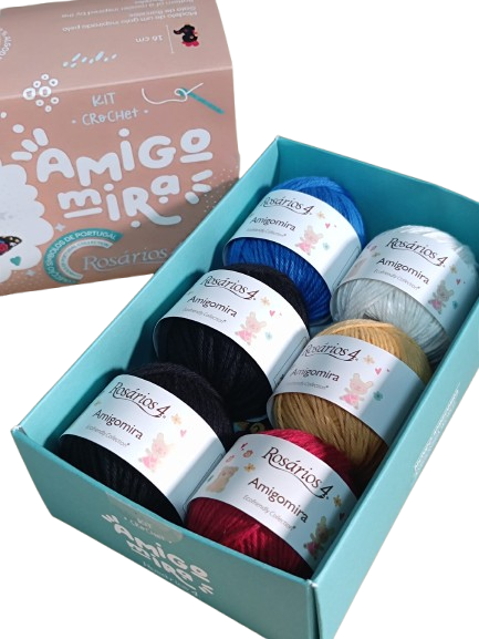 – 6 novelos x 20g de fio Amigomira (100% algodão) nas cores 95 (x2), 30, 54, 36 e 93.