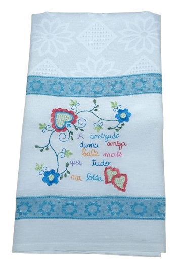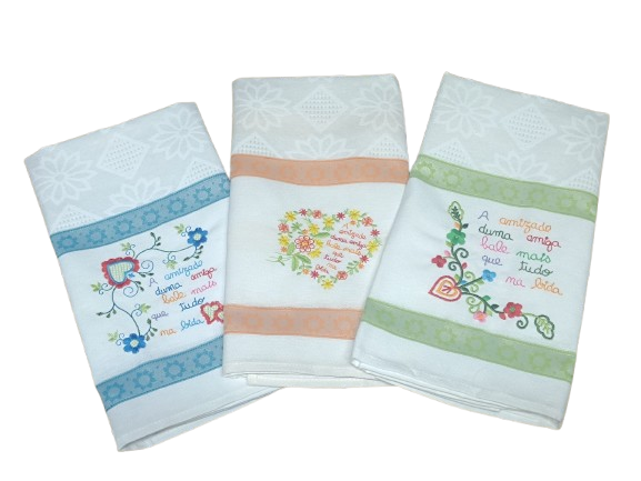 Panos de cozinha em tecido de sarja com aplicações bordadas.
