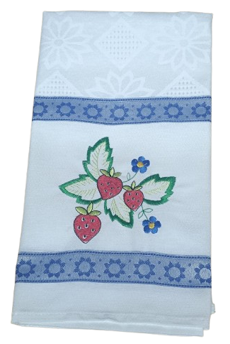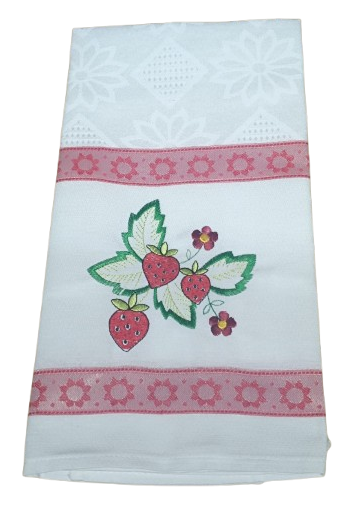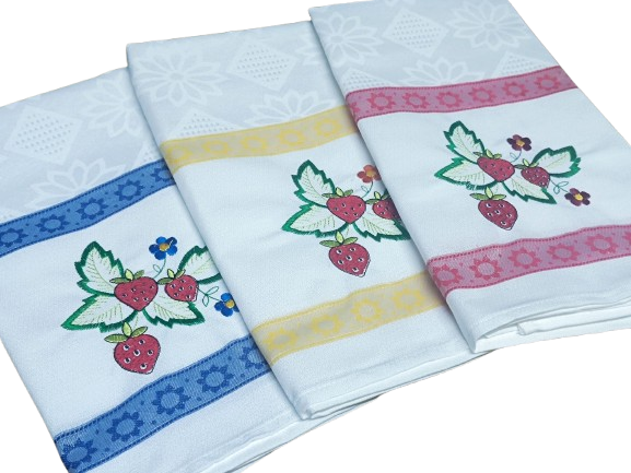 Panos de cozinha em tecido de sarja com aplicações bordadas.